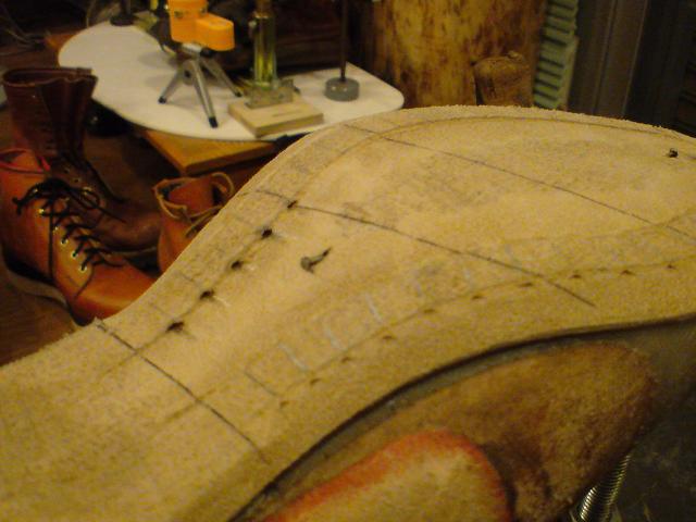 因みにホワイツ「WHITE'S BOOTS」の中底は手製のウエスタンブーツに見られる加工方法とほぼ同じで、ステッチダウンとハンドソーンの良い部分を取り入れた構造です。恐らくホワイツ独自の細革(アッパーと同素材)はステッチダウンの屈曲性を生かし、掬い縫いの糸を覆う構造故に防水性にも貢献していると推測されます。